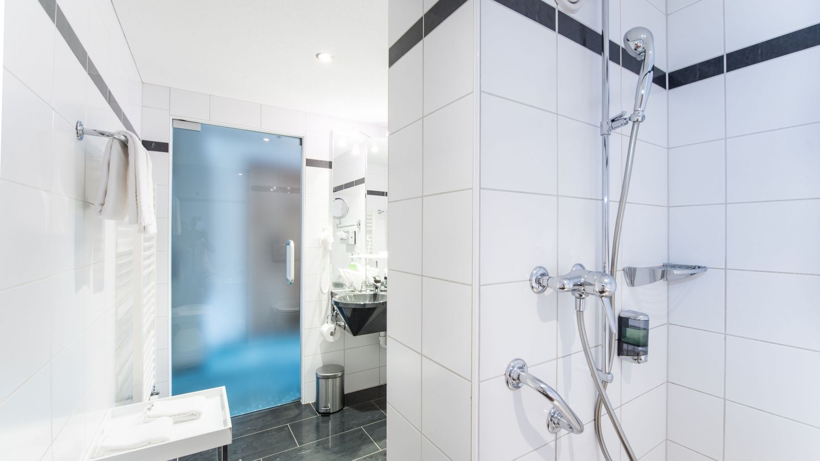 Die Wellness-Suite befindet sich im Erdgeschoss. Sie verfügt über einen Eingangs- und Wohnbereich mit Sitzgelegenheiten, sowie einen Schlafbereich mit einem Treca Boxspringbett Adonis von Betten Thaler (180x200cm), wo sich zusätzlich eine freistehende Badewanne befindet. Eingebettet in eine Nische ist das Highlight des Zimmers die grosszügige, Finnische Sauna mit angrenzender Regenwalddusche.