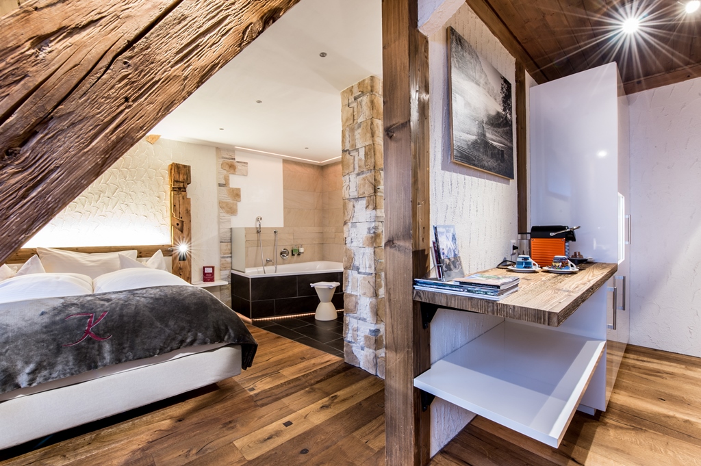 Das Zimmer (ca. 30 m2) befindet sich im Stöckli im Dachgeschoss. Es verfügt über ein Boxspringbett (160 x 200 cm) der Firma Schramm mit einer DIVINA Matratze, welche sich durch eine samtige Elastizität und ein feinfühliges Volumen auszeichnet. Ausserdem erwartet Sie eine grosse, freistehende Badewanne. Die Wände aus gepresstem Heu und Rosenblüten sowie das verbaute Altholz erinnern an den Heugaden. Das Zimmer ist auch für Allergiker geeignet.