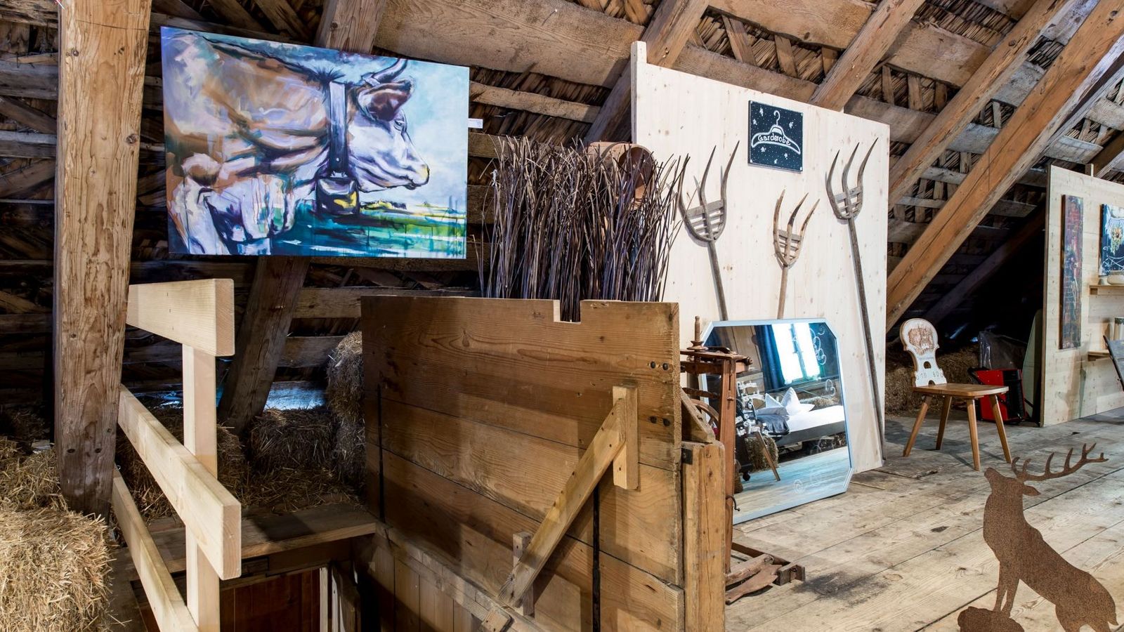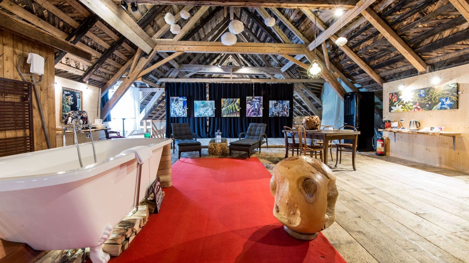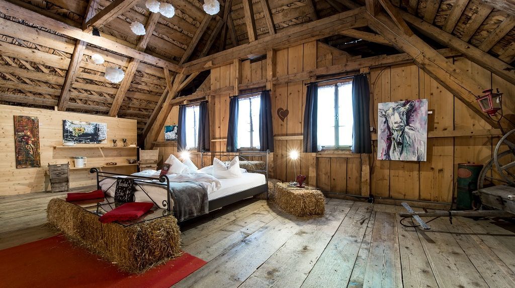 "Schlafen im Stroh Deluxe" auf der ehemaligen Heubühne des Kemmeriboden Bads. Wollten Sie schon immer mal eine ganze Heubühne für sich alleine? Geschlafen wird nicht im Stroh, sondern im kuscheligen Doppelbett. Entspannen Sie in der Badewanne inmitten des XXL-Schlafzimmers (150 m2).