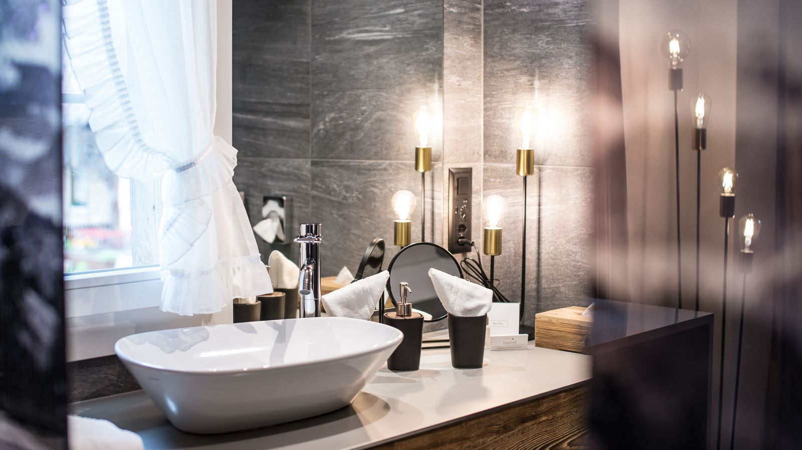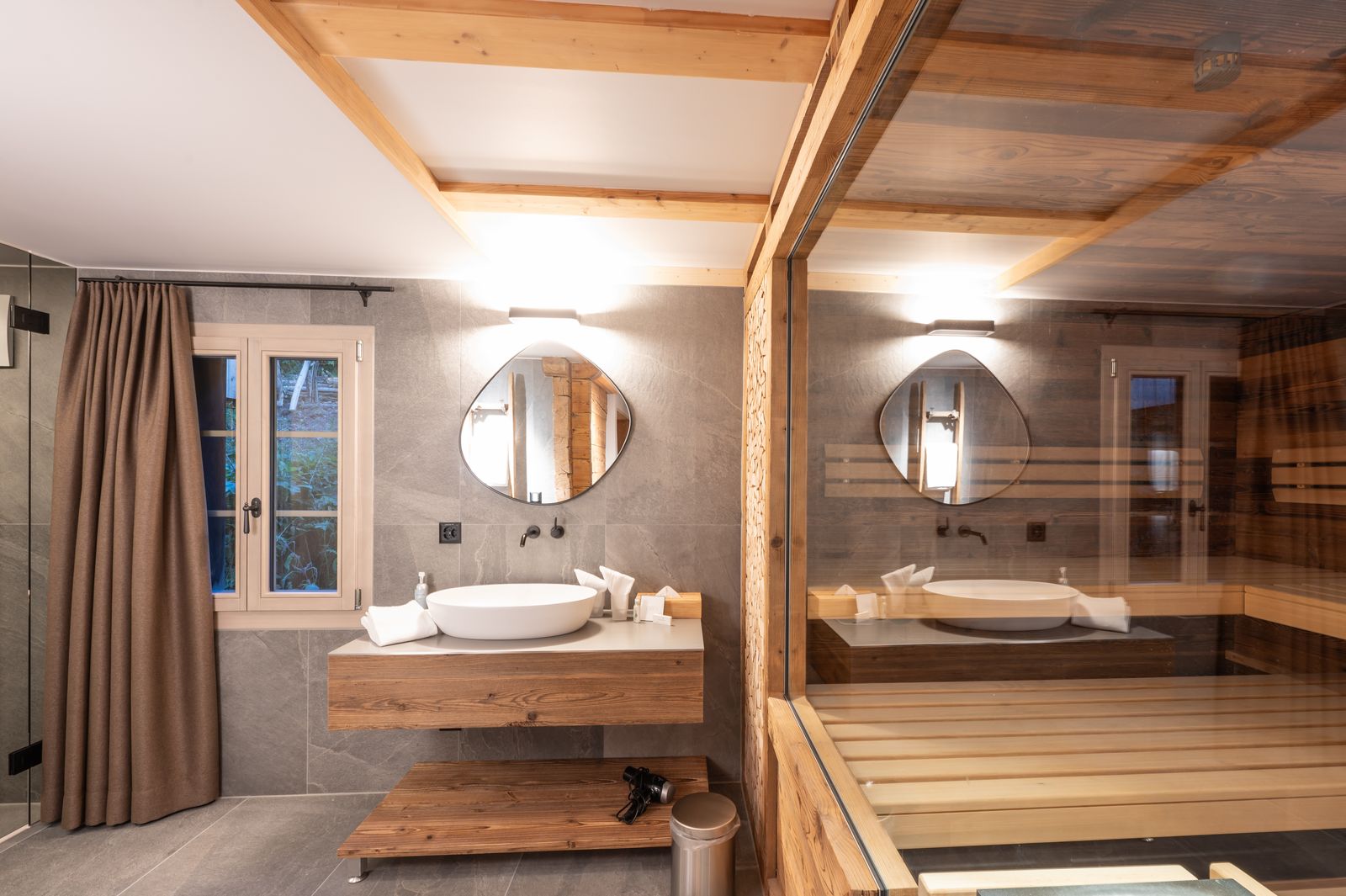 Die Wellness-Suite befindet sich im Erdgeschoss. Sie verfügt über einen Eingangs- und Wohnbereich mit Sitzgelegenheiten, sowie einen Schlafbereich mit einem Treca Boxspringbett Adonis von Betten Thaler (180x200cm), wo sich zusätzlich eine freistehende Badewanne befindet. Eingebettet in eine Nische ist das Highlight des Zimmers die grosszügige, Finnische Sauna mit angrenzender Regenwalddusche.