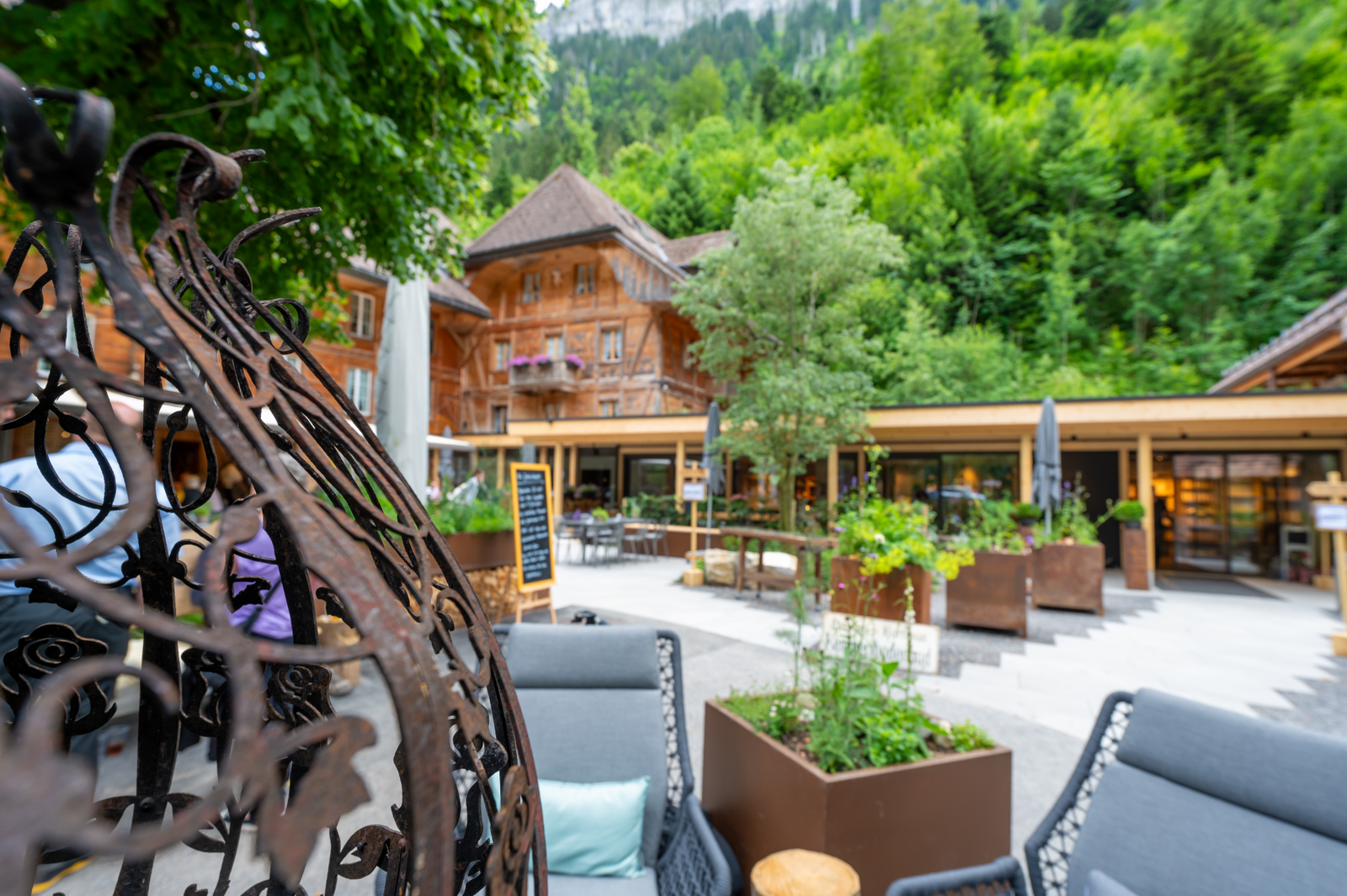 Auf dem grossen Vorplatz sowie rund um die Gebäude bieten Ihnen unzählige Tischkombinationen, Liegen und Lounges Platz, um sich nach einer Wanderung oder einer Biketour ausgiebig zu erfrischen. An einem sonnigen Sommernachmittag laden die gemütlichen Plätze ein, den Ausflug ins Kemmeriboden-Bad bei einer Merängge gemütlich ausklingen zu lassen.
